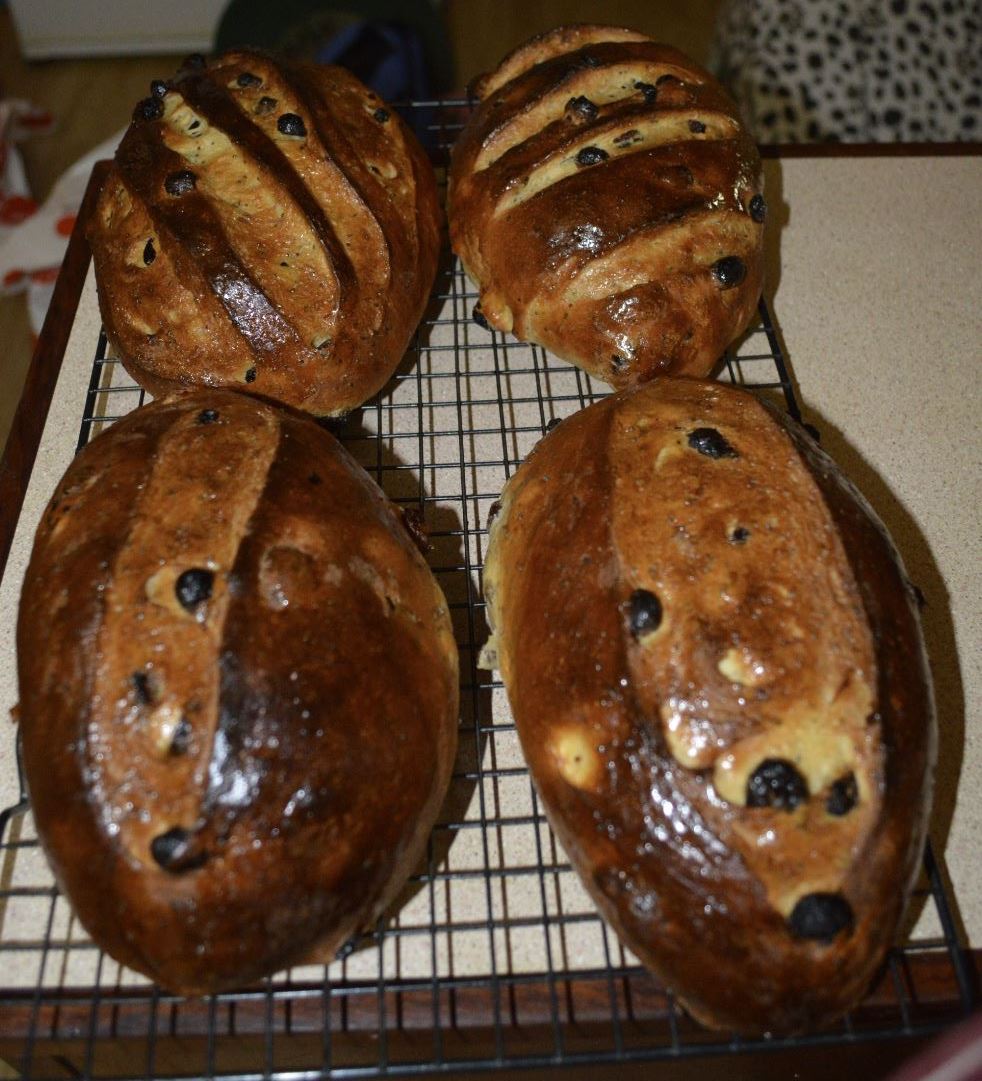 This is the first time i have scored fruit doughs so did a variety of patterns. i originally intended making a 800g dough but when i had squeezed the orange juice i had to recalculate the recipe to use it all. and ended up with 1773g dough instead and 4 loaves at 443g.