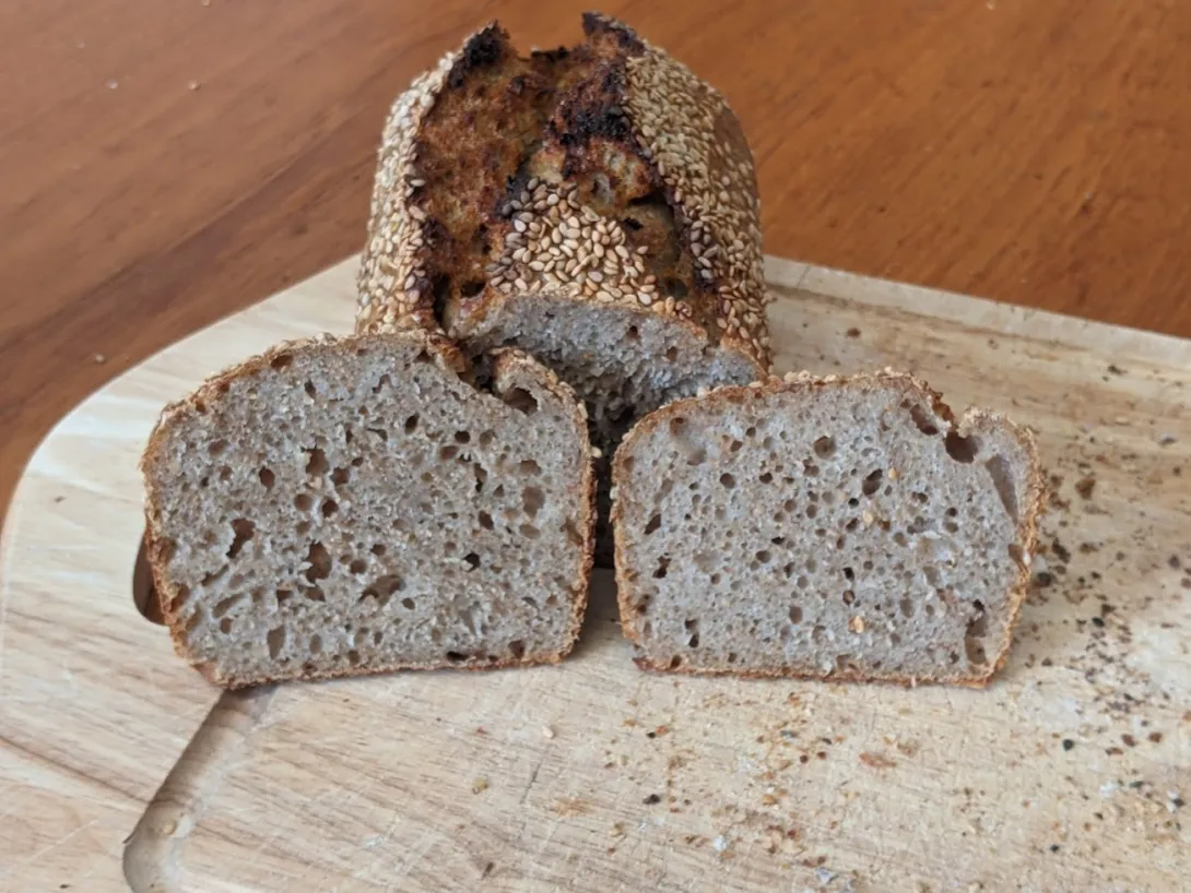At first it appeared that everything was going well, I did some stretch&folds and slap&folds, it seemed to develop some strength. Then I left it to ferment for a few hours with occasional stretch&folds. However in the end the dough was weak and sticky, as if overfermented - although there were barely any signs of fermentation visible. I think the discard brought too much acidity and the gluten never formed properly, or got degraded very quickly. So I just dumped the dough into two small tins (could have put in one, but I was worried it might decide to grow), sprinkled sesame seeds on top and left in the fridge overnight. Didn't notice much growth by morning, but when baked the bread had a nice oven spring, and generally looked good!