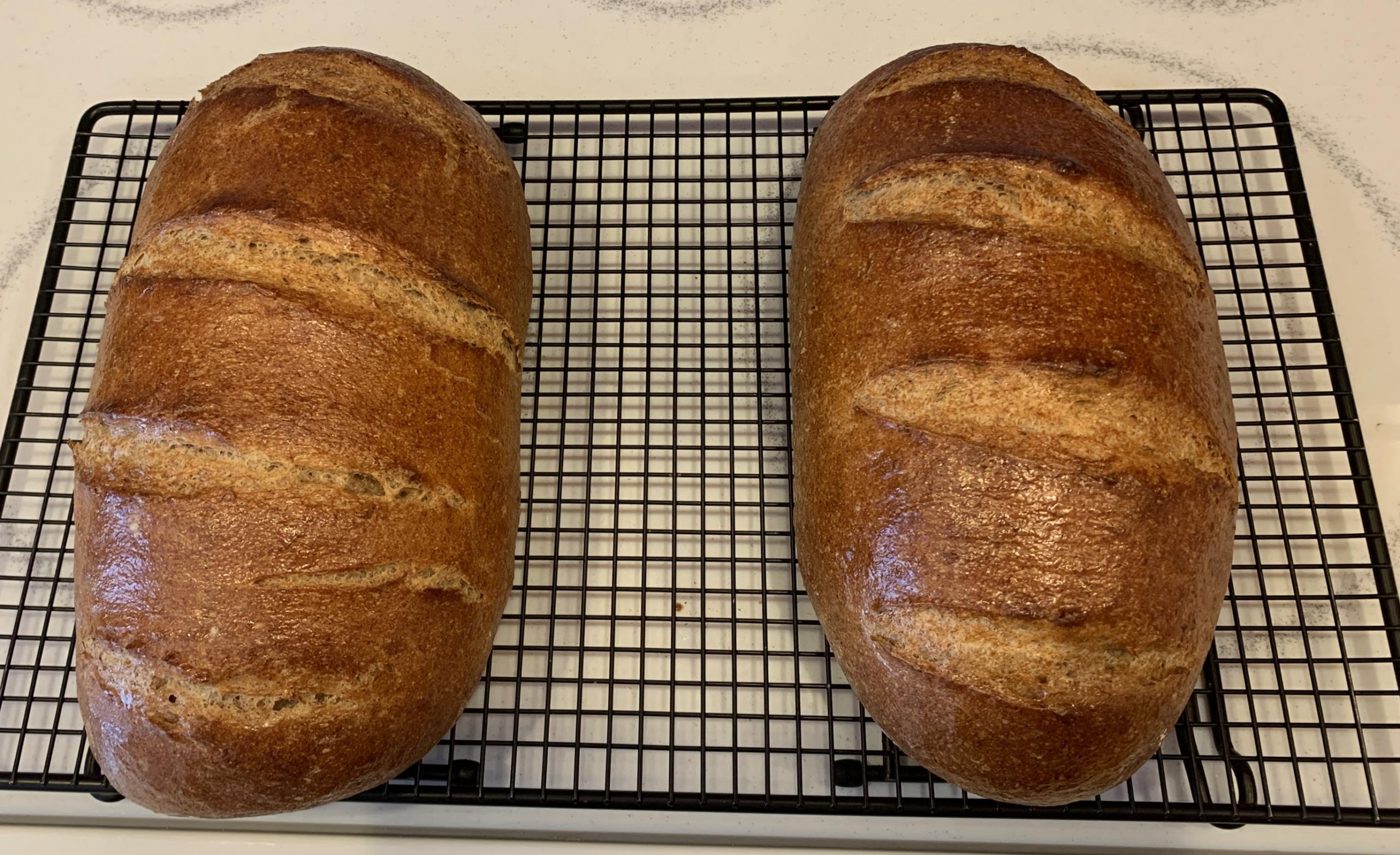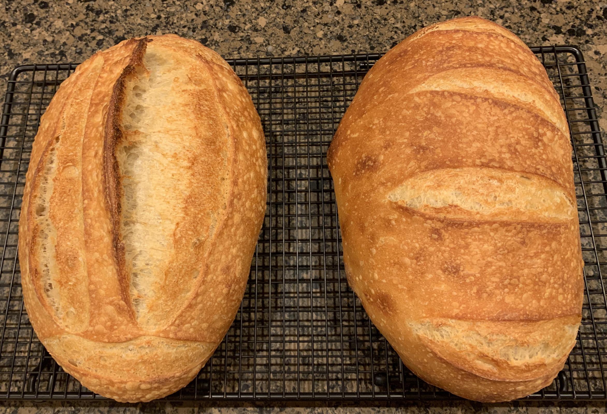 The doughs came out of the bannetons a little different. One was already kind of short and fat, so I scored it with four horizontal cuts, which helps it elongate during the bake. The other I scored so it would open wider. I created a time lapse video of this bake. There isn’t as much noticeable spring in the elongated loaf as it started a little taller and it tended to expand longer. Both of these loaves are spoken for and were just baked this morning, so no crumb shot.