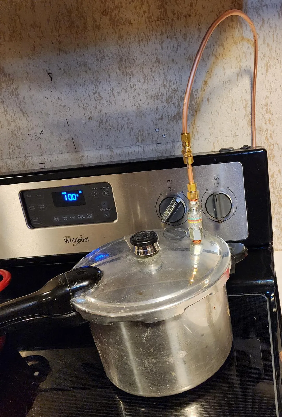 I found an area in my stove on the back wall and drilled a 5/16" hole thru it at the botton corner. Pushed the line thru it with about 2 in exposed in the oven, used straps to affix it to the screws along the back edge of the stove, looped the line overtop the stove to the placement of the pressure cooker and attached the valve and couplers. And thats it!