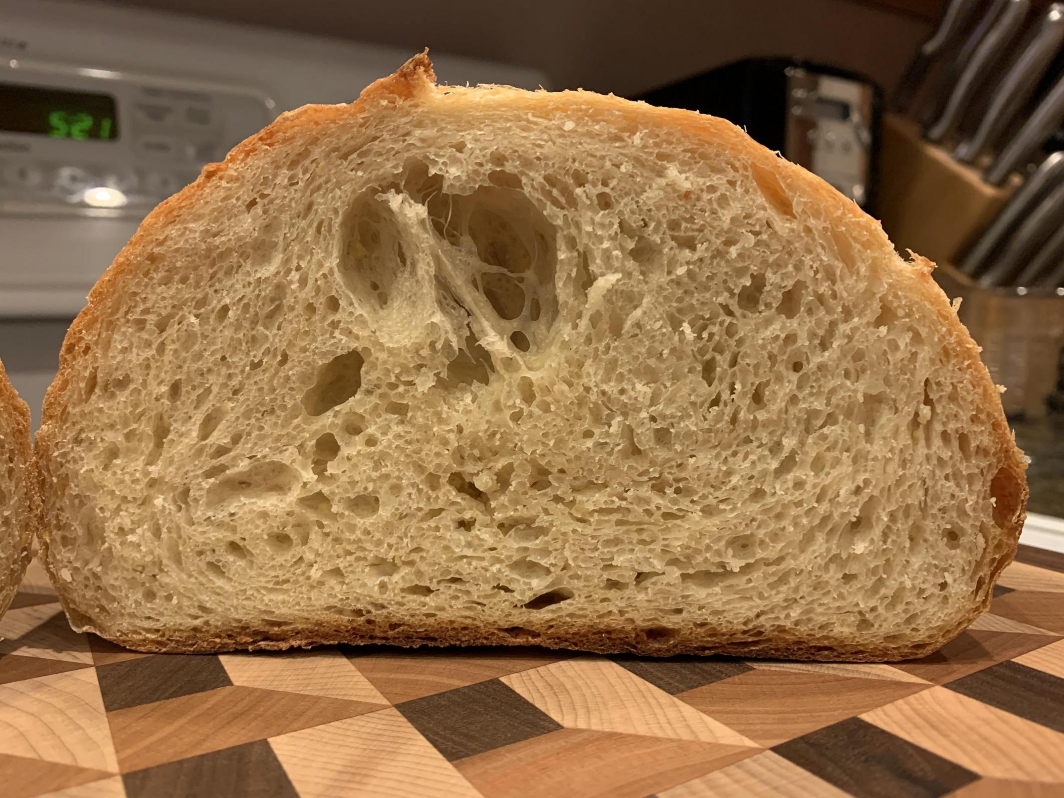 Next time (and there will definitely be a next time), I will bake at a slightly higher temp to try and get better spring. Reduced the heat a little because I was worried about burning the loaf bottom with the milk in the recipe. Bottoms looked good, so I will bump it up a bit. That being said, I do like the thin, soft crust with the lower temps.