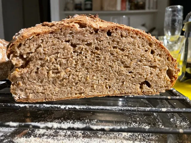 The recipe specifies rye type 1150 and spelt type 1050. I only had whole grain flour and used that. Initially the flour seemed like it was struggling to absorb all the water -- but in the end, the dough sucked up everything -- and felt like it might be a little too wet.