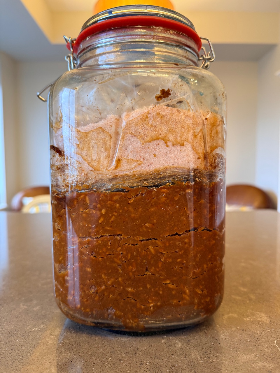 Miso batch #3 started on May 1, 2022 photo today. This one won’t be touched until we return in the spring from Florida. Hopefully it will be even darker and richer by then. However, we keep the apartment cooler when we are away so that will slow things down a bit.