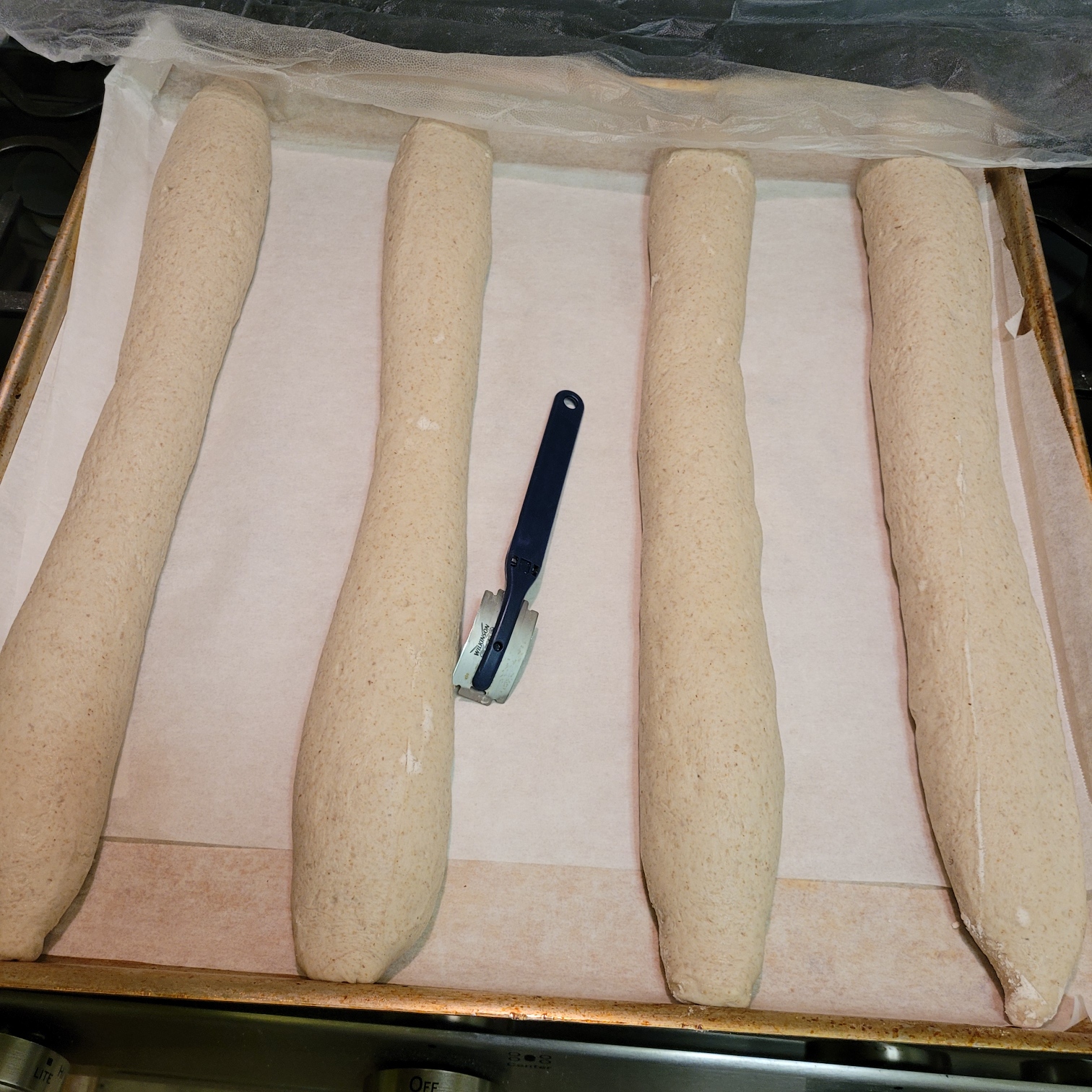 I was careful about getting the length right this time to avoid compressing them into the 16X16 baking pan. 151/2-16" is an inch shorter than I prefer. However, at that length, I can bake all four in one pan. Fingers crossed for an even better finish!