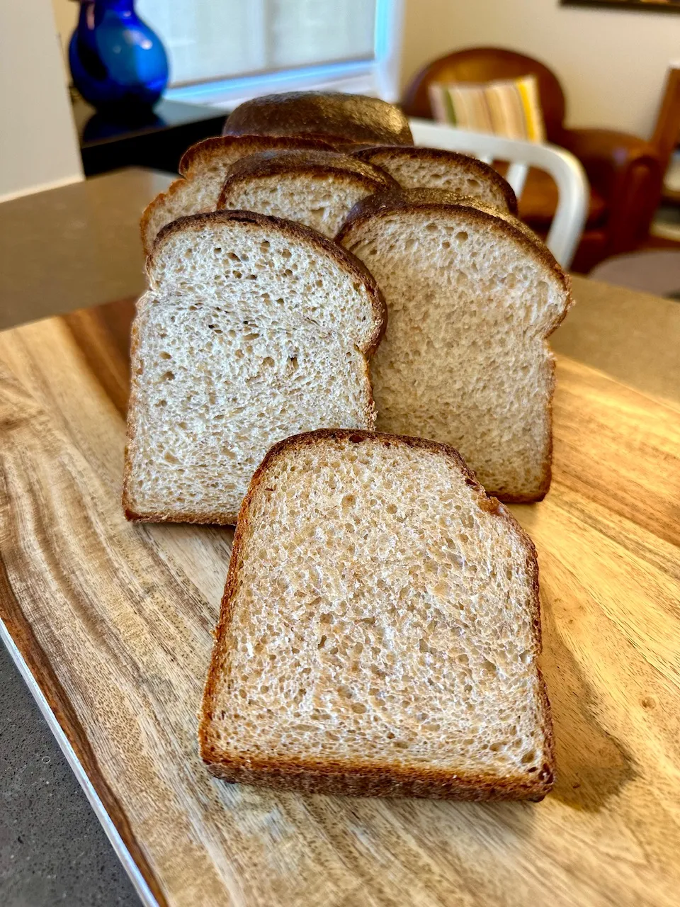 Bake the loaves for 50 minutes or until the internal temperature is at least 190ºF, rotating as needed to get even browning. Shield your loaf if it gets brown early in the baking process. After 50 mins remove the bread from the pan and bake a further 10 mins by placing the loaf directly in the oven on the rack with the oven turned down to 325ºF