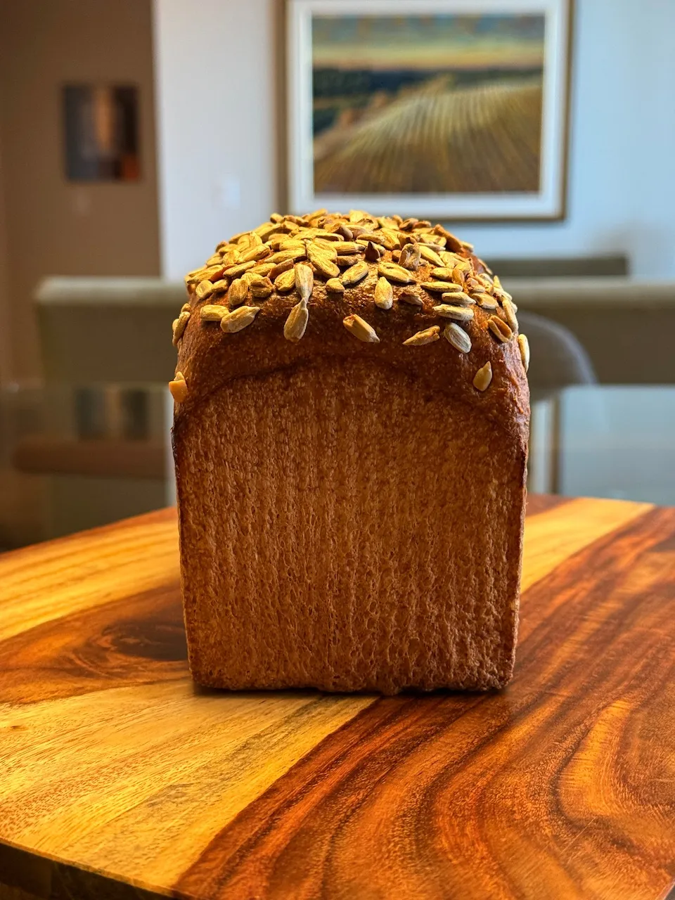 We were out of bread again since we’ve been away so much and I haven’t had the time to bake as much as I like to. I also didn’t have much time to plan and do something different. When I realized that I hadn’t done a 100% whole wheat bread in a while I pulled out my tried and true 100% WW SD Hokkaido Milk bread formula which is now onto a 4.0 version. I have to say that this is one of my best bakes in sometime. Usually there are somethings that could have been better with each bake, some tweak that I’d so next time. This one however, there really isn’t much to complain about. I’m so happy with the oven spring this 100% wholegrain loaf attained. The four lobes each rose so evenly. When I measured the dough for each lobes I made sure that the center two were equal but heavier than the outer two. I usually make all four the same weight, but wanted to see what would happen with the center two being heavier. I’ll need to do this again on a few more bakes to see if there is an advantage to doing this, but my first time doing this suggests that there might be.