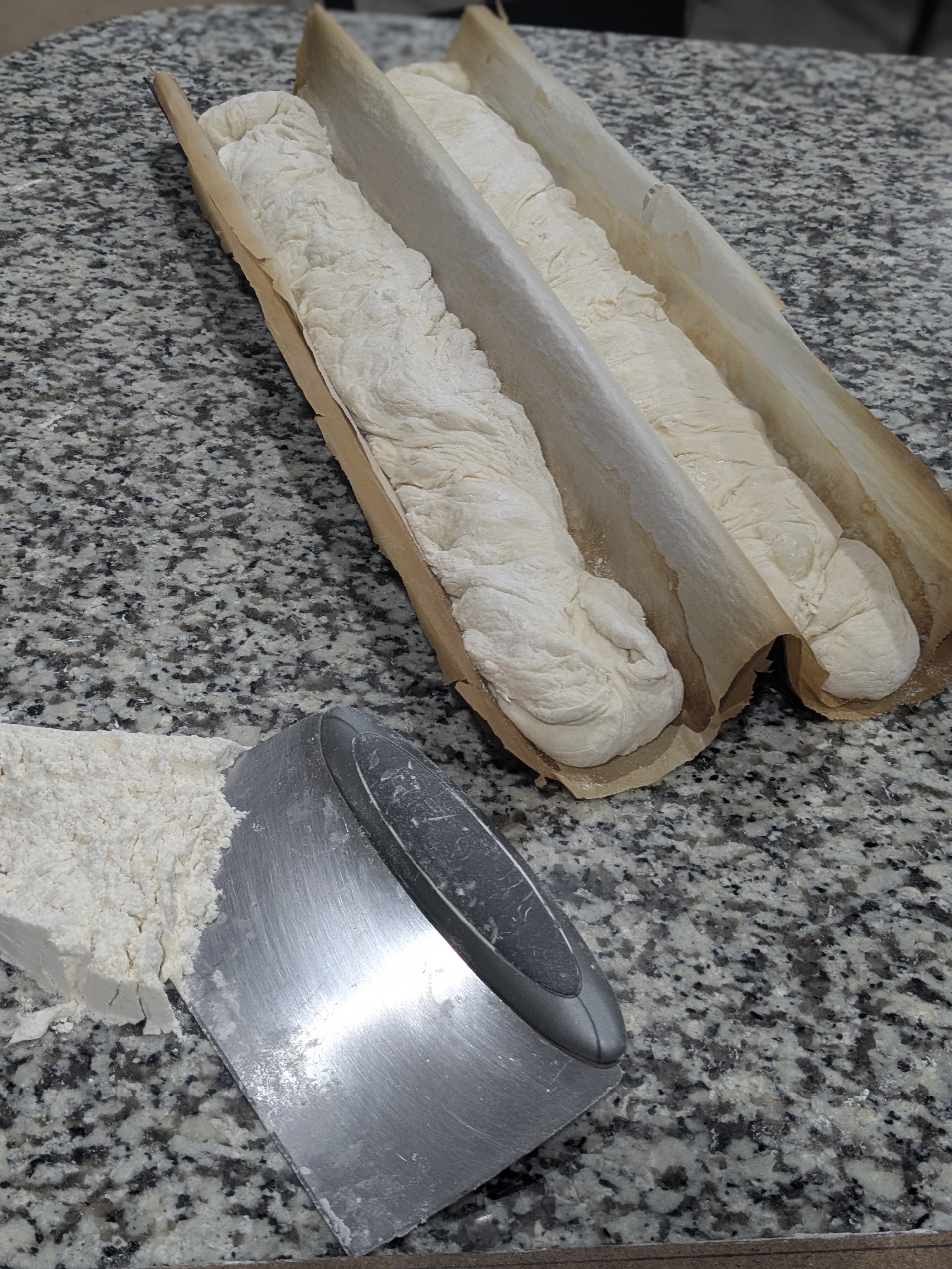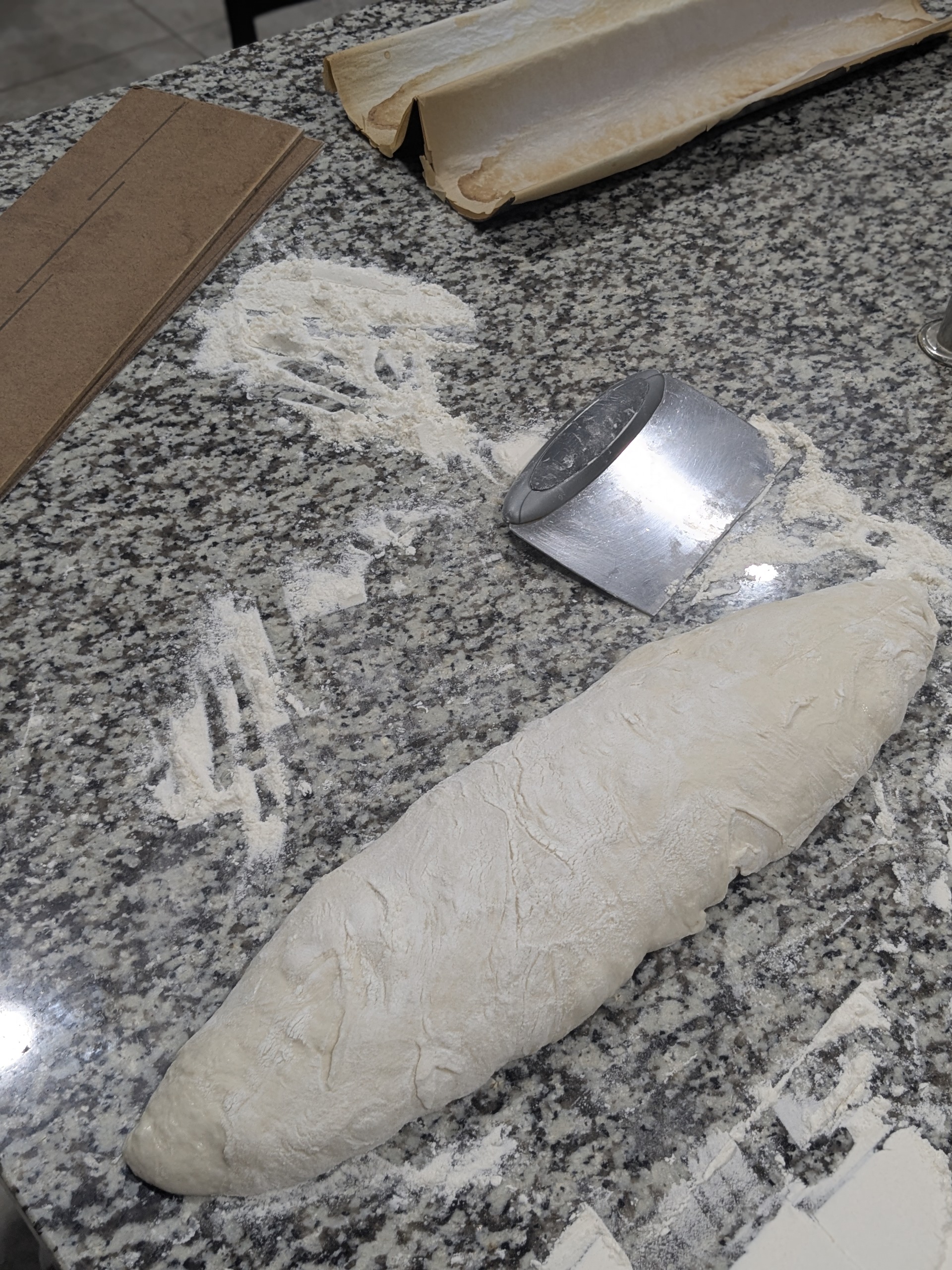- Using a floured bench knife and floured hands, ever so gently fold the top of the dough to the center. Then the bottom to the center. Repeat this at both sides. The goal is to create some tension in the dough, and achieve a rough baguette shape.