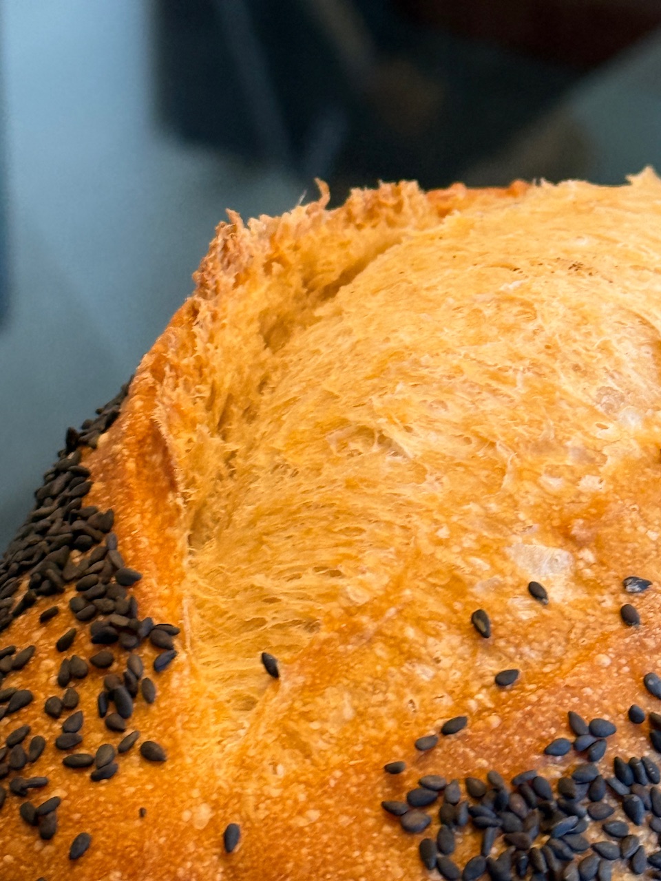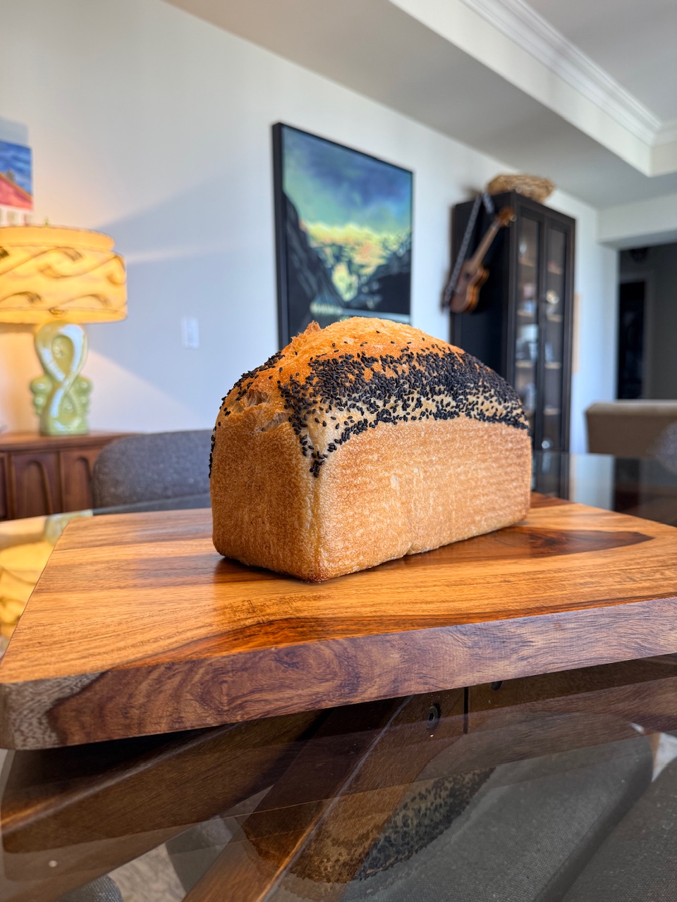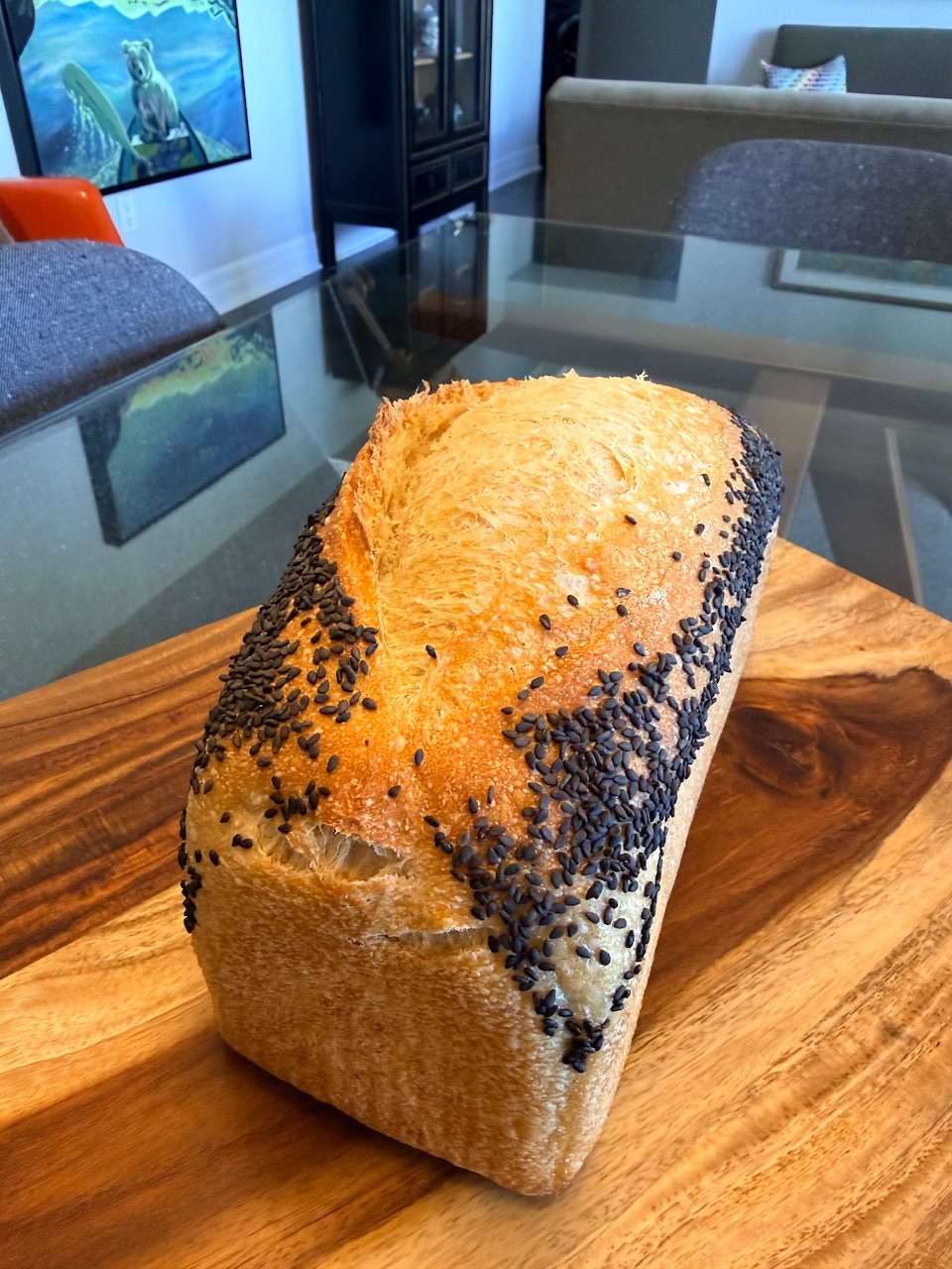 I got my hands on my whole kamut recently. I haven’t had any in quite some time. I’ve always loved that sunny yellow hue it gives the crumb. Similar to semolina, I find that sesame seeds really pair well with it. I haven’t sliced it yet but wanted to post this anyways. This one is another lean dough with a high pff at 40% which is now my standard for these types of Pullman loaves. I love the tiny blisters on the crust, even along the sides where the crust was in contact with the pan. I love how simple and stress free these bakes are. From the end of mixing in my Ankarsrum Assistent to the beginning of baking was just under an hour.