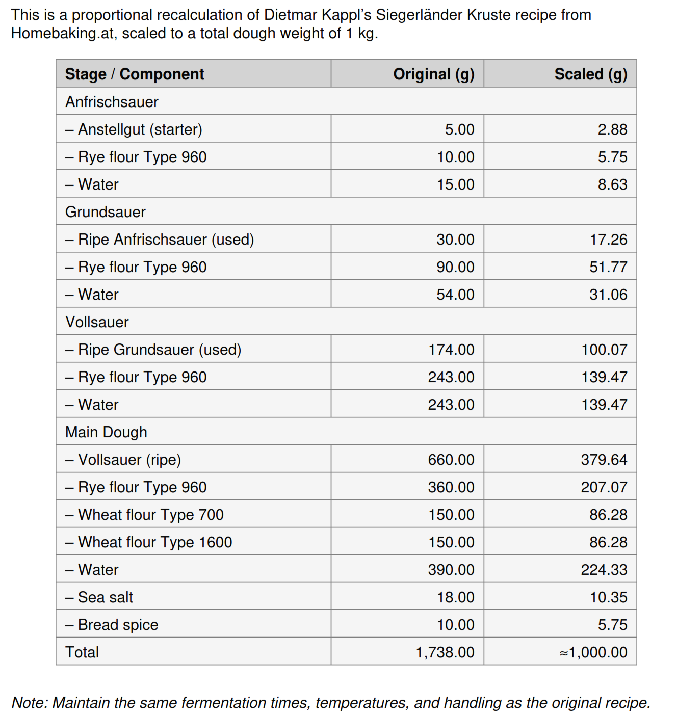As an example, I found a recipe on homebaking.at for Siegerländer Kruste - a Roggenmischbrot. Dietmar's recipes tend to be "spread over the page" rather than tabulated, so I asked ChatGPT to produce a downloadable tabulated pdf and also (and more importantly) adjust ingredient weights to give a total dough weight of 1000g from the original 1738g.