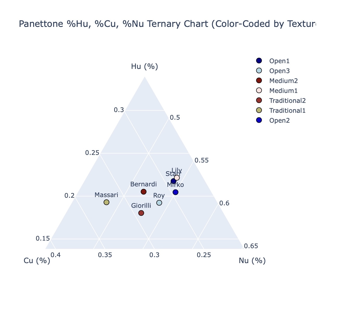 I recently became more interested in the balance of enrichment factors in the dough, and I am now also calculating what I call %Nu, or enrichment index. I felt that just studying sugar and hydration wasn’t enough, and that we should also look at enrichment, and its balance in the dough. On my ternary chart, Hu, Cu and Nu values are compared between several recipes, with values increasing as you move toward the origin points.