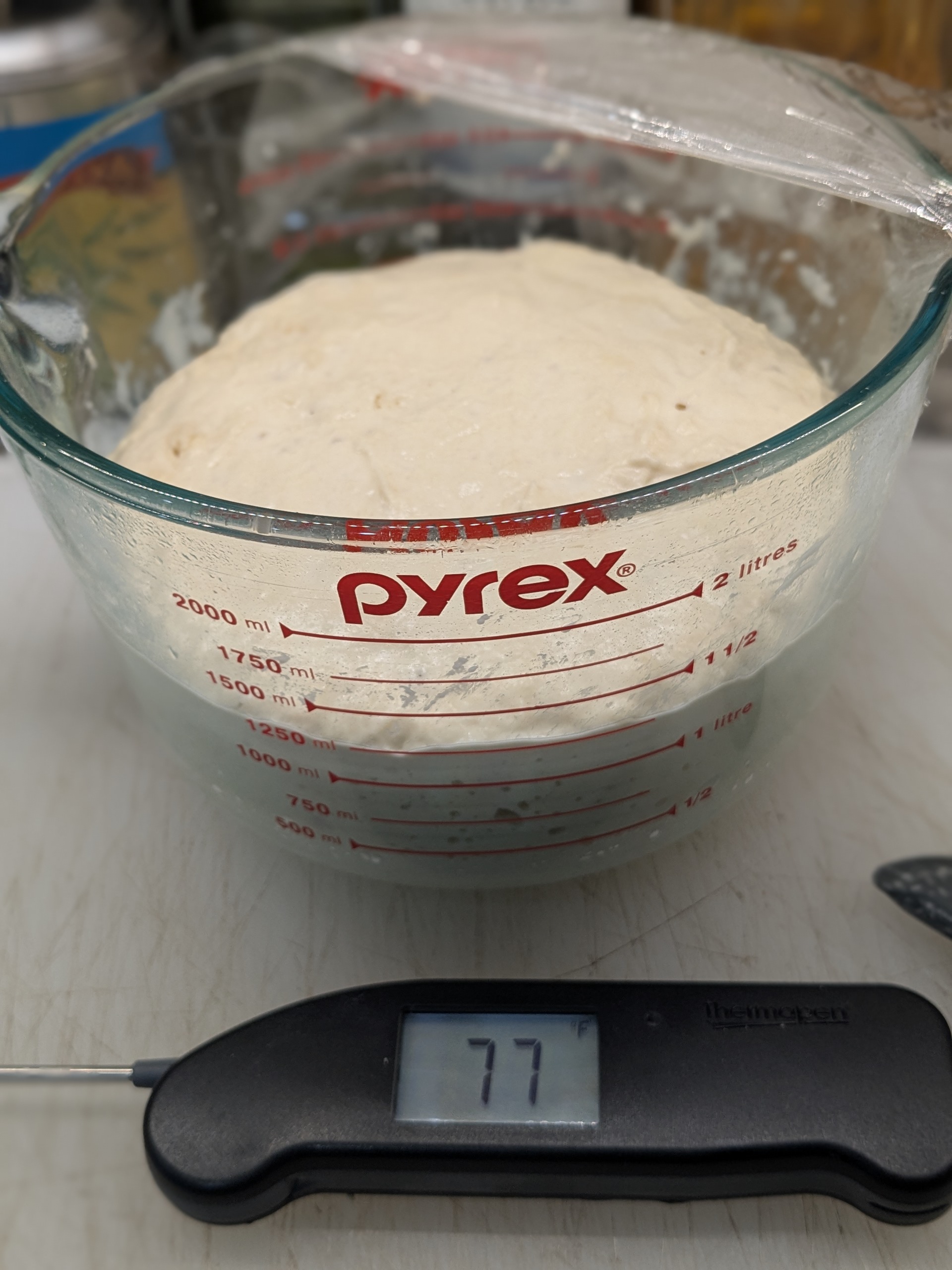 To compensate for the warm kitchen, I am shaving some time off the bulk ferment.