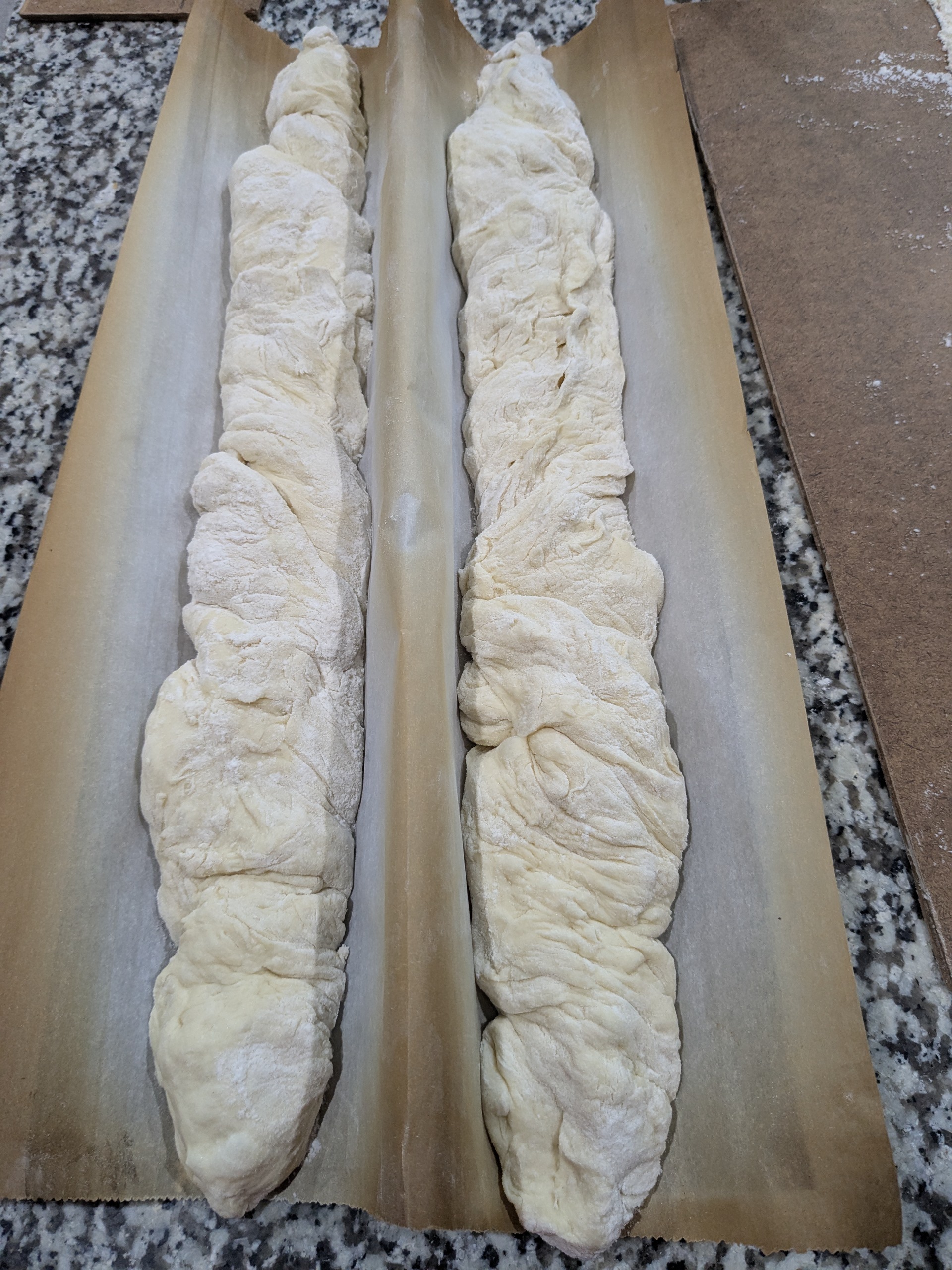 The bright lights of Paris, to the southern Mediterranean Coast town of Palermo. Parisian baguette, Filone Rustico con Semola All systems go! Log in or register to post comments The Filone dough. ( Two hrs. In)The no knead 90% hydration ( for all intents and purposes) dough has just about doubled.The low hydration Parisian baguette dough.is looking much less shaggy, after the first of four rubaud fold. Log in or register to post comments Just before the third rubaud fold the Parisian baguette dough has expanded nicely.With just about 60 minutes to go in the Filone bulk the dough is very active and more than doubled in volume. Log in or register to post comments Beginning proofDivide and shape Log in or register to post comments Very satisfying. Log in or register to post comments To compensate for the warm kitchen, I am shaving some time off the bulk ferment.The end game Log in or register to post comments