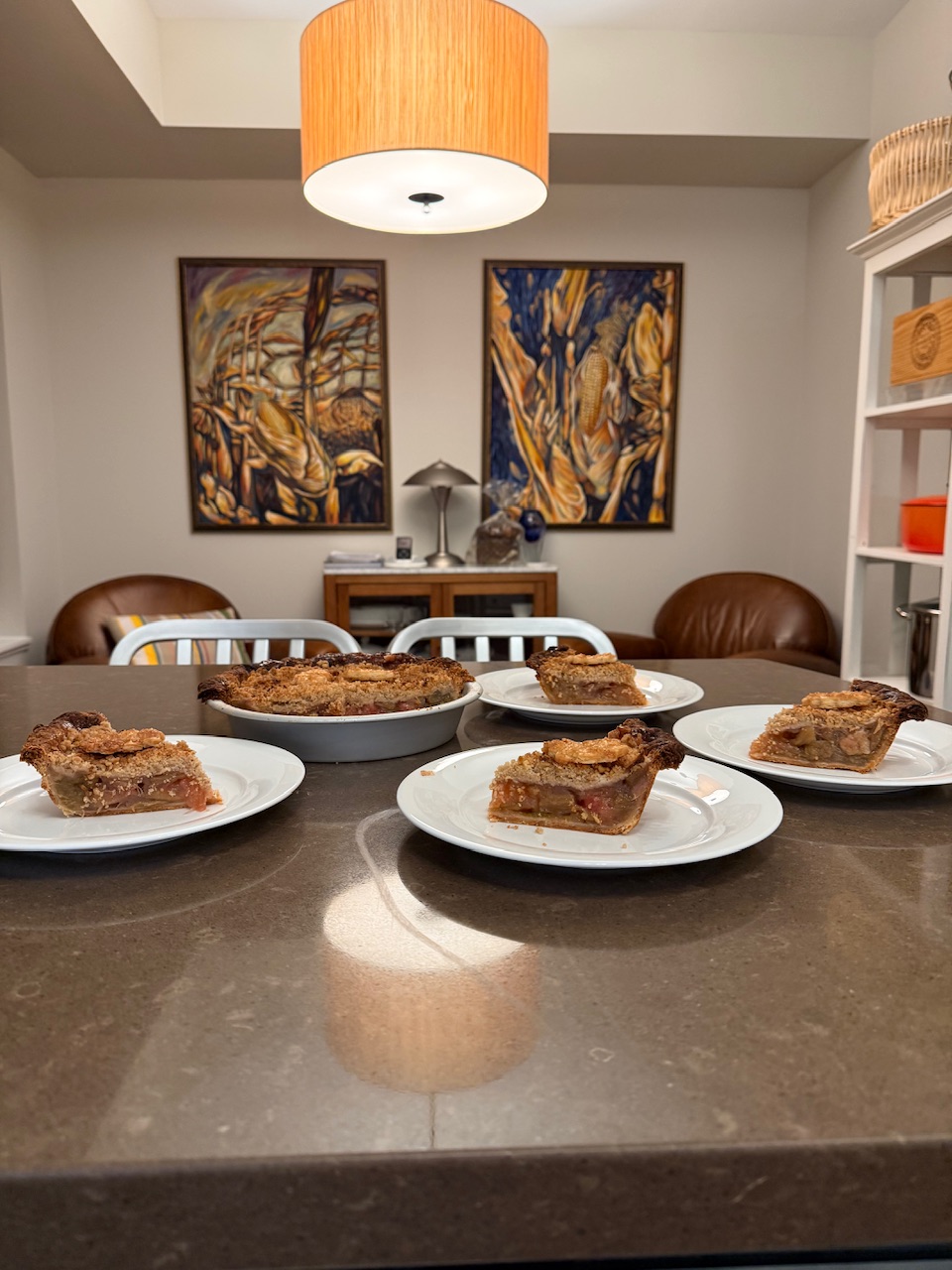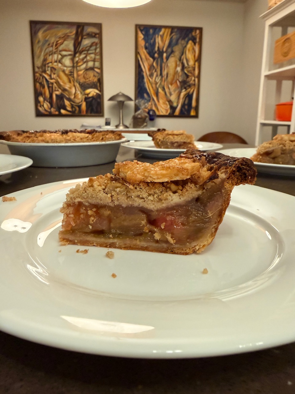 It had been a long time since I’ve baked a pie and we are having friends over for their birthday dinners tomorrow.  Using the rhubarb a good friend sends me each year from his country home I decided to make a rhubarb pie.  No other fruit just rhubarb.  I’ve actually never had a rhubarb only pie and thought it would be interesting to try.  The rhubarb filling is spiced with nutmeg and I’ve left it nice and tart but with a decent amount of sweetness.  Rather than just my usual plain streusel topping, I’ve added nutmeg and walnuts to the streusel to tie it in with the filling.