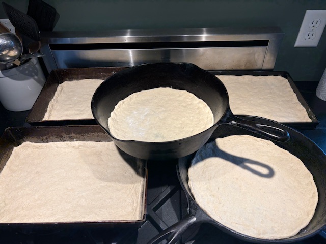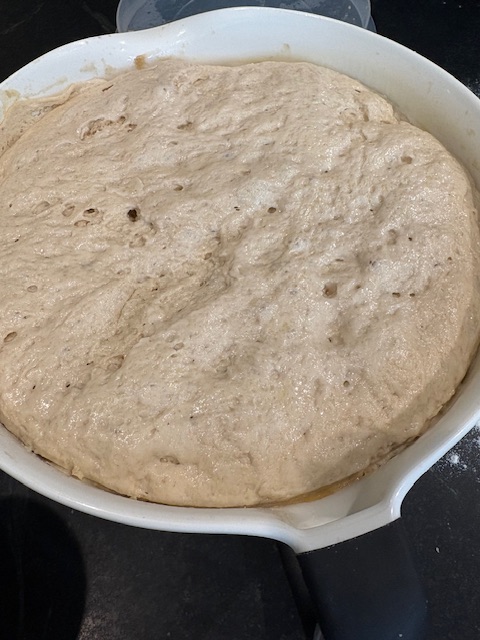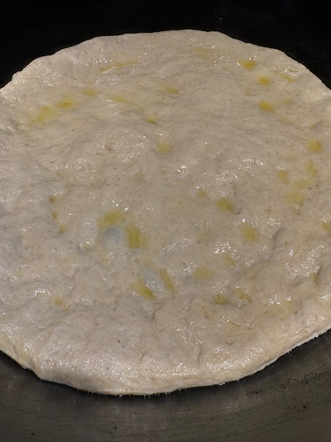 Stirred everything together til moist. Left it 1 hr. Turned it out and did two wet laminations rolling it up after each. Oiled a large bowl and placed dough in bowl. Did 4 folds to coat with oil. Left in warm place to rise. Retarded over night. Took out and divided into 3/ 500g and 2/ 250g crusts. Buttered all pans and skillets . Pressed dough in brushed lightly with EVOO and let rise 2°. Baked 2 at a time @ 425° 10 minutes.