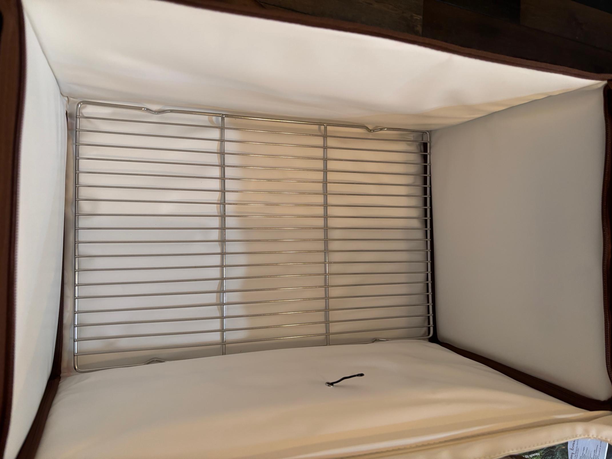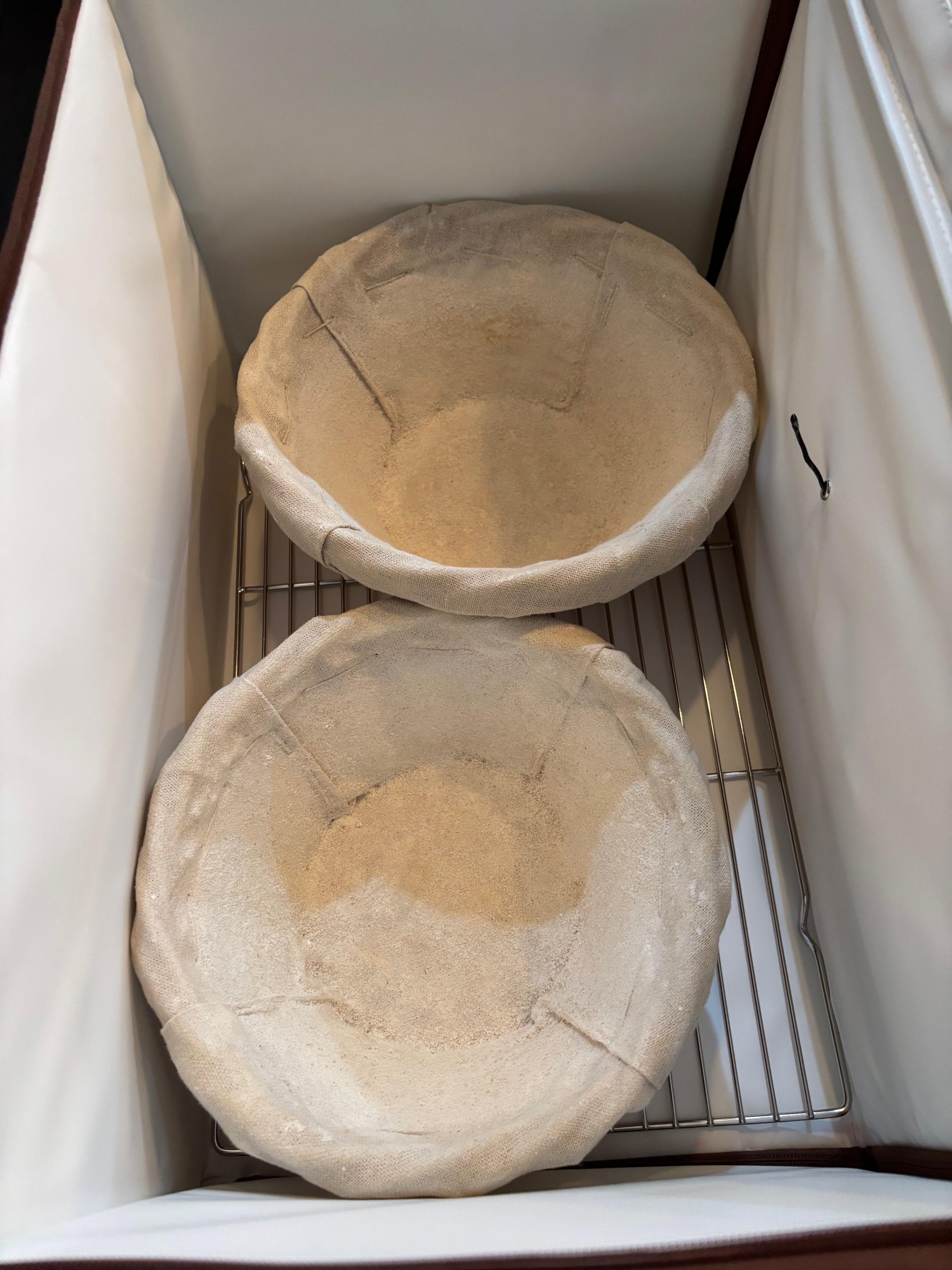 The one that I wound up purchasing (currently priced at $69.99), while larger than most, can just barely accommodate two of my bannetons. It also can reach 130F, which is useful for other tasks like making yogurt or reliquifying honey that has crystallized. It can fold nearly flat for convenient storage. There are zippers around each end panel that hold it upright or allow it to fold down. The front, bottom, and rear panels contain heating elements. The top has a clear plastic panel that allows the user to see how what's going on inside. While I haven't used it yet, I did set it up and turn it on just to see how it functioned. It came up to the set temperature rather quickly, which is encouraging. The controls are straightforward and simple. I'll be interested to see how it holds up long term.