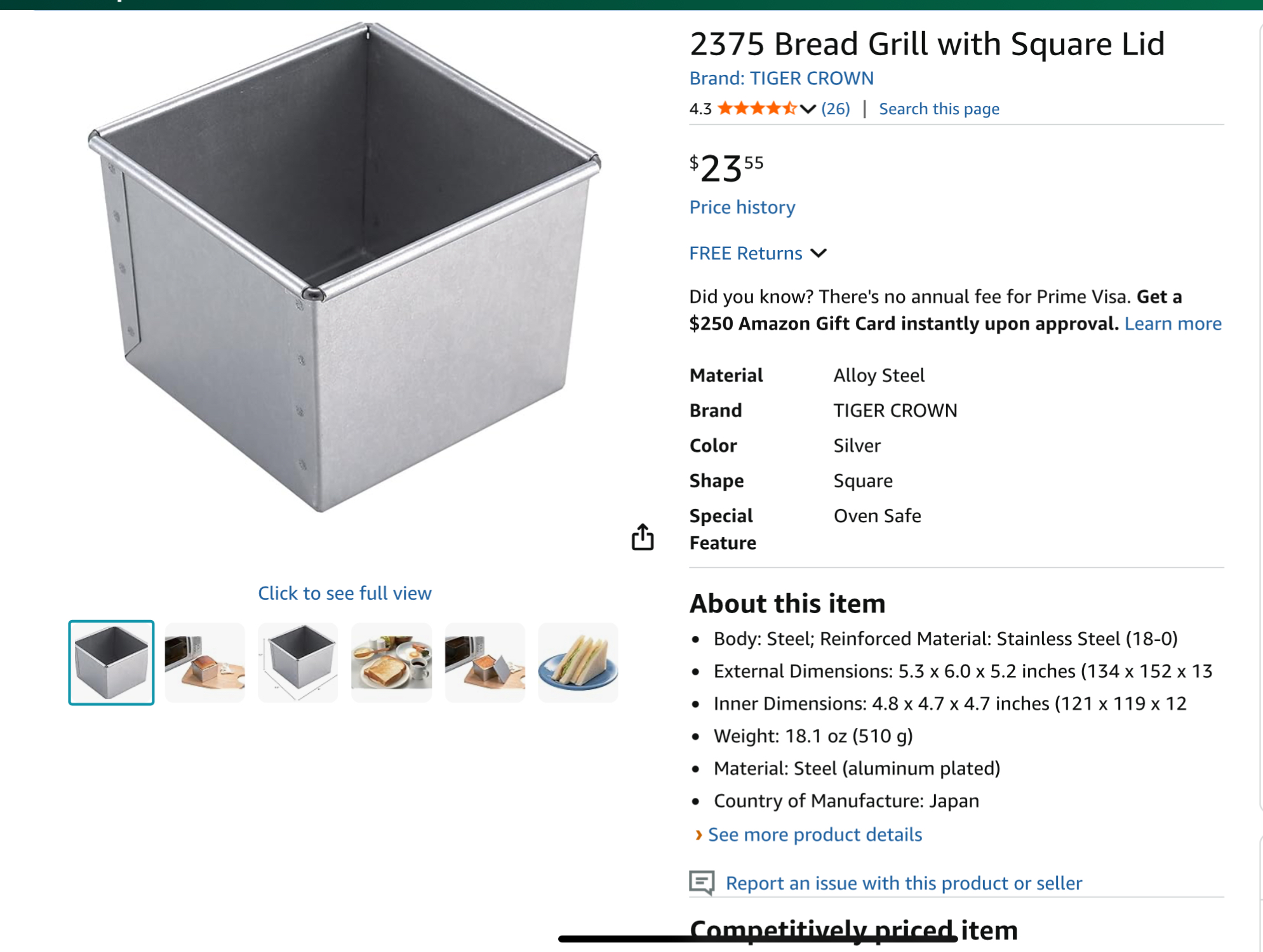 So anyway when it arrived today I was a bit underwhelmed to see it in person because of the size. The length is ok, but the width I feel is too small.  Compared to a normal sandwich loaf that you buy in the store this is half an inch to one inch skinnier. I wish there was a version of this that was 4.5" x 4.5" at least or even 5" x 5". That would be a perfect size square loaf.