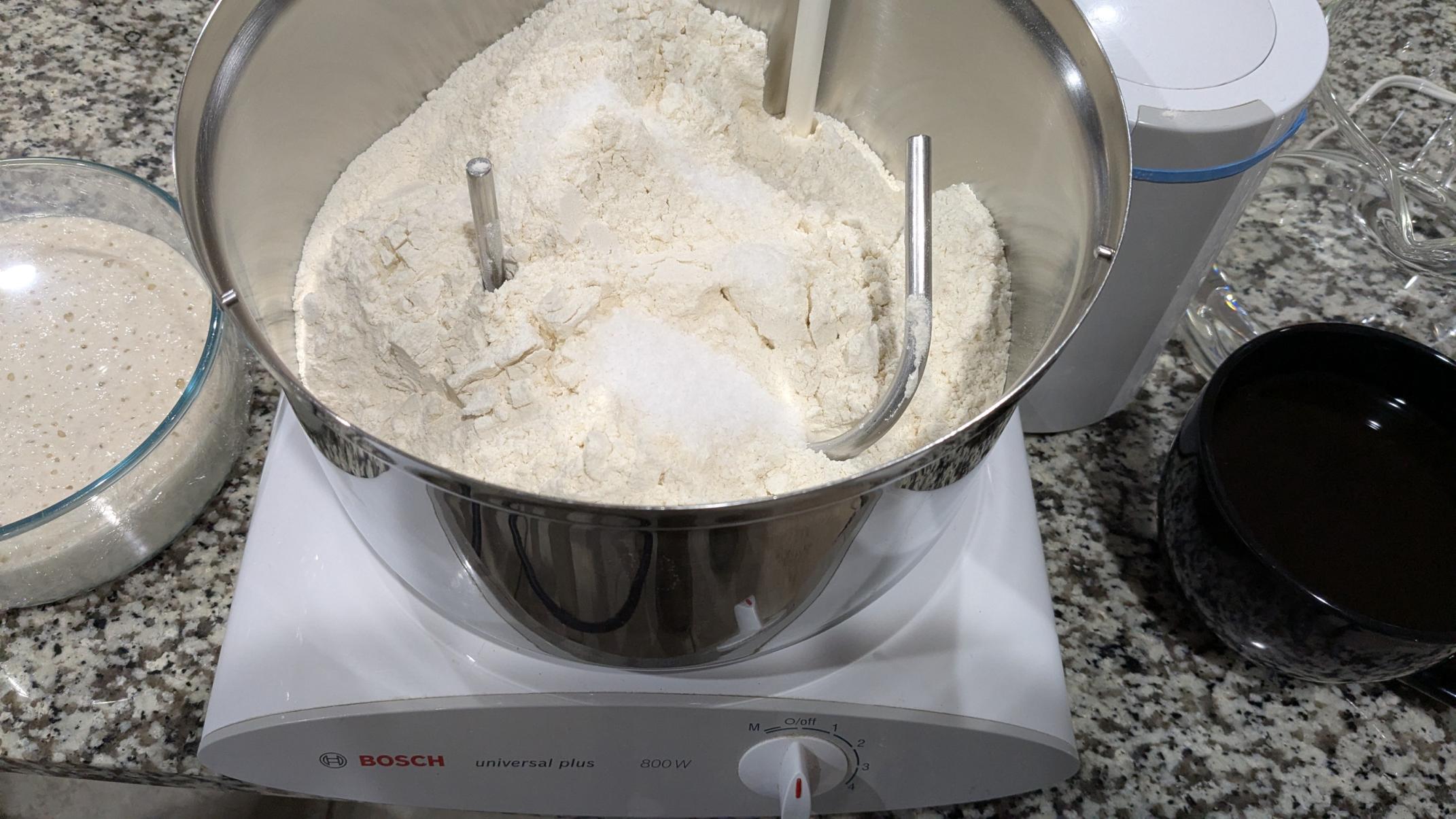 Since this is a double batch of relatively low hydration dough, I opted for the improved mix process. Rather than the more labor intensive rubaud hand mix.