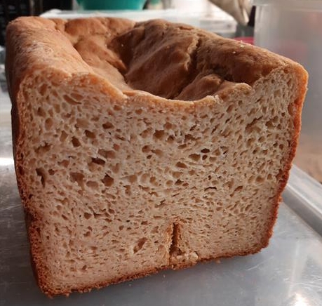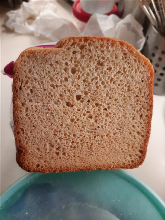 I would wish a higher rise, a more plastic texture (note from the picture that the loaf cracks rather than splits as a wheat bread) and a less gummy mouth feel (sigh, how do you replace gluten with gum and not have it taste gummy?). Any suggestions?