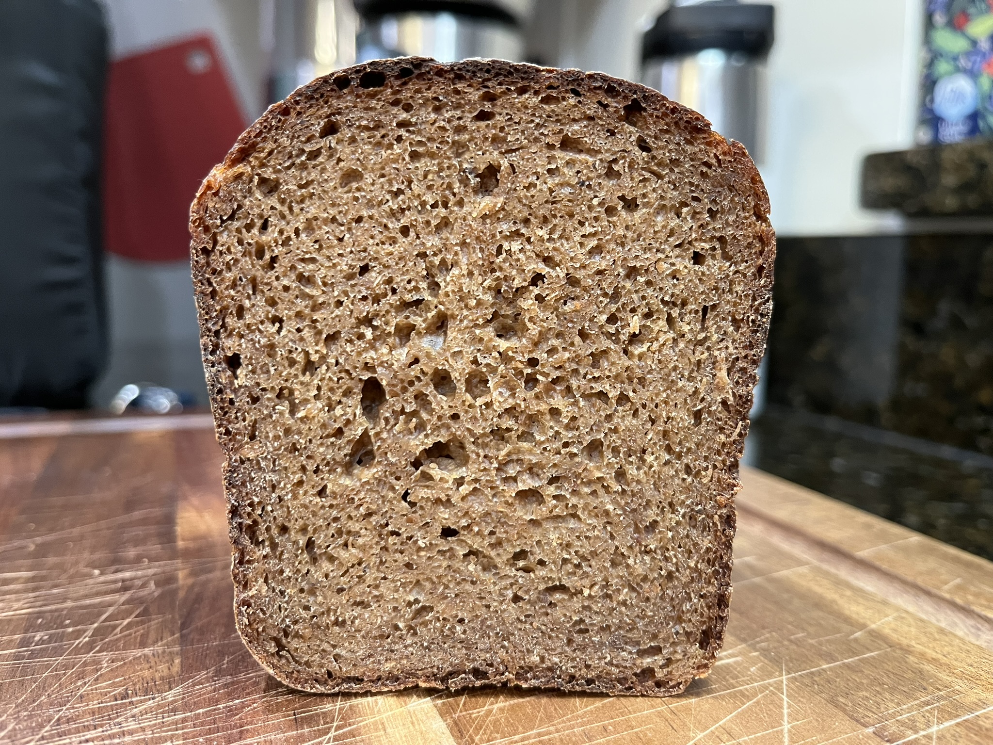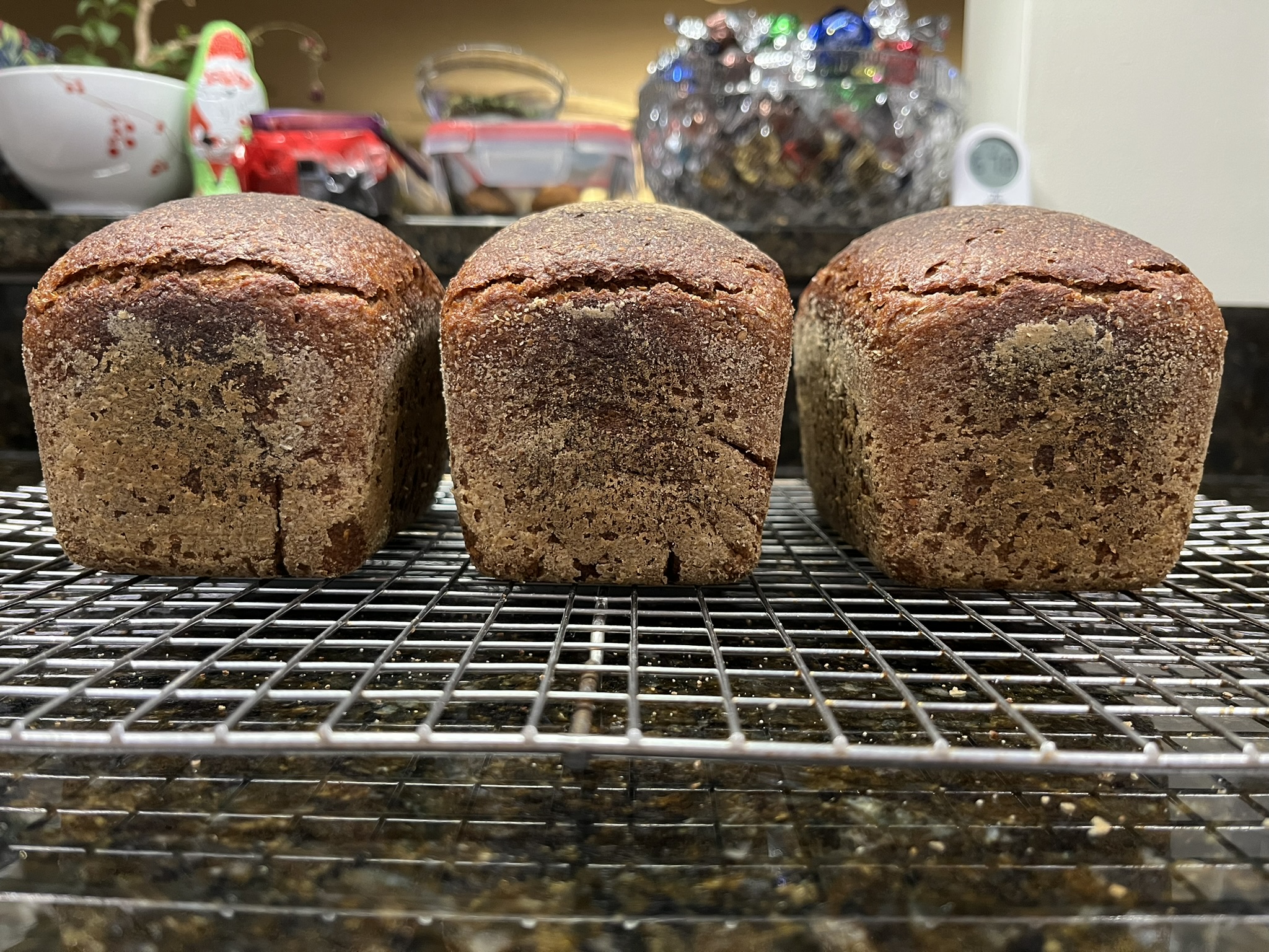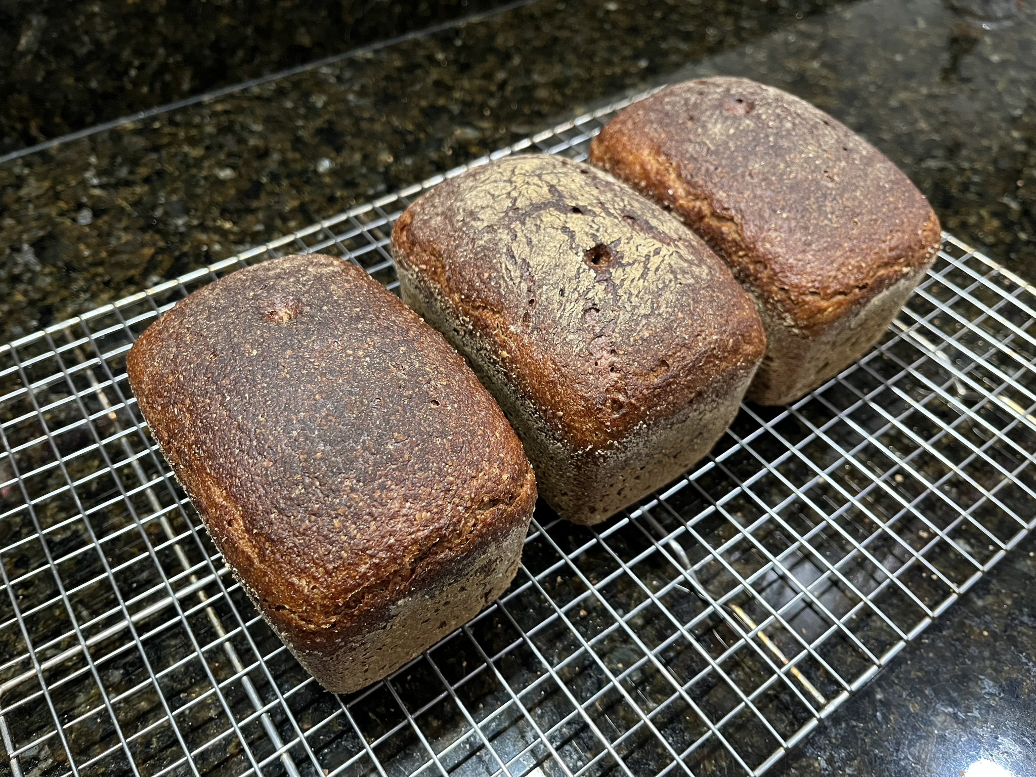 I pretty much followed Hamelman's recipe (scaled for three of the recommended L11 pans so 1500 grams of dough) with two changes. One is that I used first clear flour instead of the all purpose and I inoculated the sourdough with 10% instead of 5% starter. It is curious to me that this is the only sourdough recipe in this chapter that specifies this smaller amount of starter for the same fermentation time and temperature. I just felt it would not ripen enough. Hamelman does not provide the reason for that. After 4 hours of bulk it was time for dividing. The dough was somewhat sticky but nothing that a little flour wouldn't fix. I used the Polish T720 rye flour for that and it worked very well for that. The proof was right on schedule as the loaves looked ready after the 2 hours so in the oven they went! Pretty hot, too, at 500°F. Then lowered, and lowered again as I noticed the loaves come out a touch too dark on top if I bake at the specified temperature for the specified time in my oven. The most difficult part was waiting before slicing the loaf. It came out excellent!