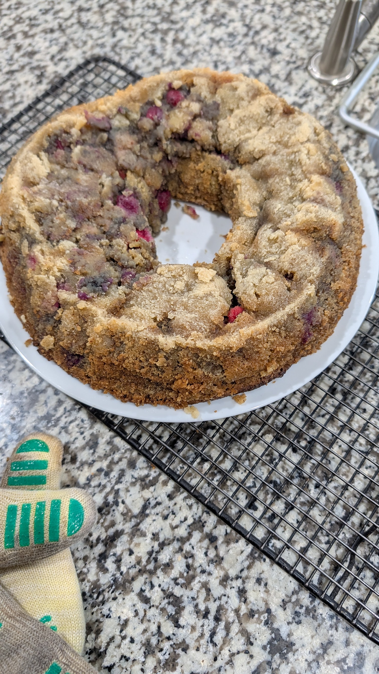 1. I forgot to add in the cranberries. I was forced to add them to the batter in the Bundt pan. Surly this effected the airateing effect I worked hard to achieve.