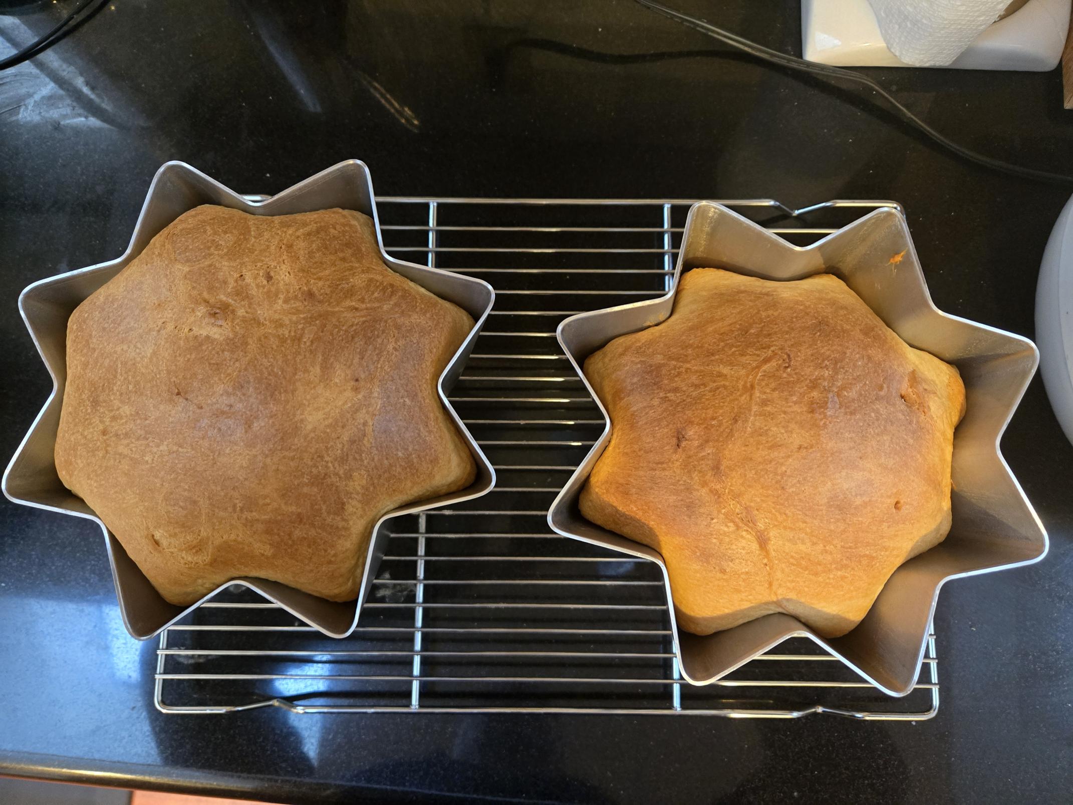 I attempted pandoro for new year's and am quite proud of the result! Very similar process to panettone (lievito madre, 2 doughs, obscene amounts of egg yolks and butter). The crumb is tighter than panettone and it doesn't have the same riot of flavors and ingredients (no candied fruit or raisins or chocolate, for example). But there's something more elegant about its simplicity? It's like a very nice brioche, but with that beguiling texture of these long-fermented dessert breads (soft but toothsome). I made a 1kg batch and split it between 2 500g star-shaped molds.