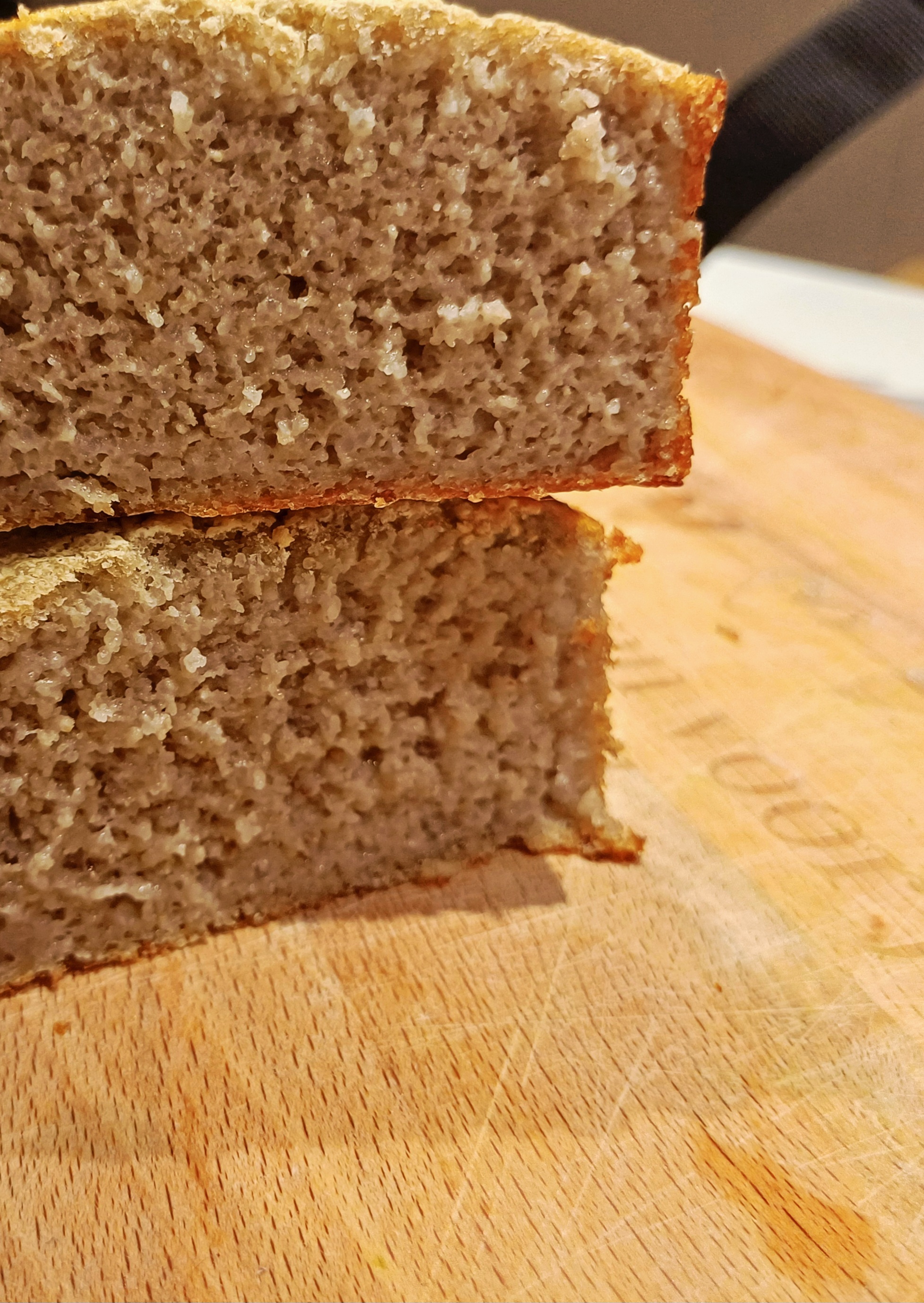 A thick dosa batter can be steamed to form idlis. I decided to try baking my dosa batter in a small tin to see if a nice gf bread crumb could be achieved. Indeed!