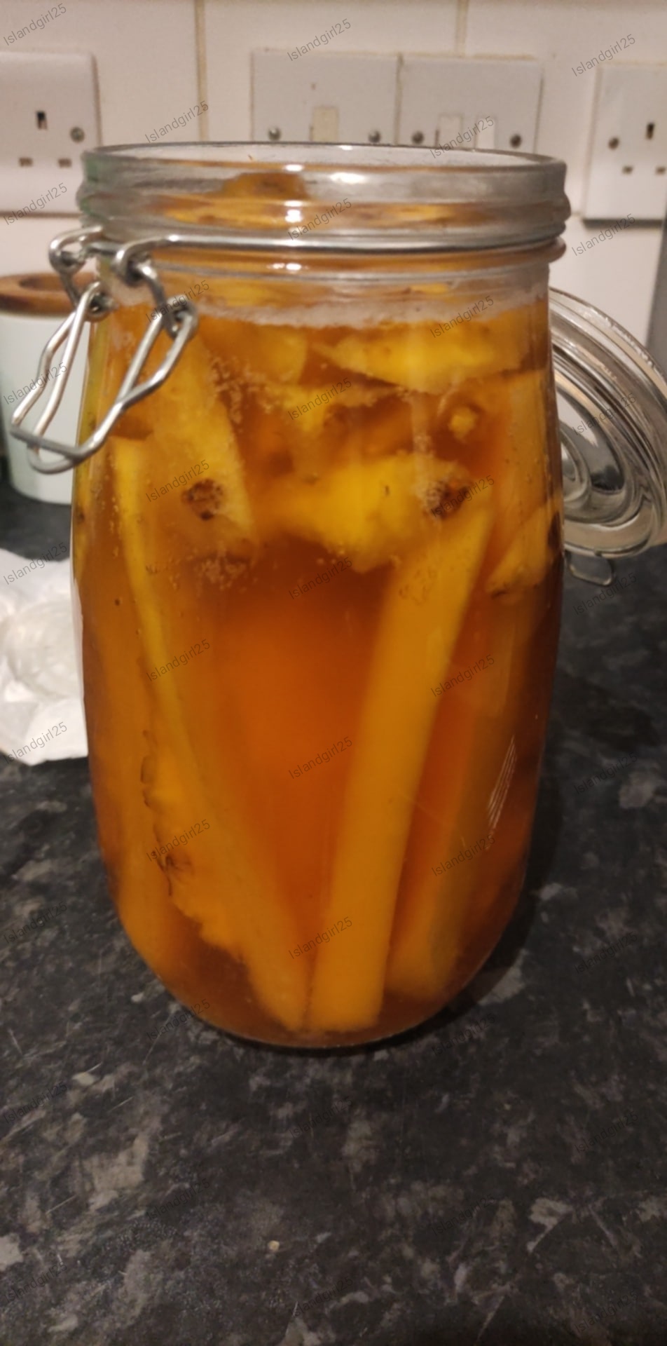 I made tepache one weekend from the peels and core of a pineapple I bought from the supermarket and some Indian jaggery that was languishing in my cupboard. I made sure to wash the pineapple skin very well to get rid of any chemicals and dirt. I followed a simple recipe without the spices and put all the ingredients in a large kilner jar and covered it with cheese cloth. After 24 hours there was already a lot of tiny bubbles on the surface of the liquid and after 36 hours I tasted it and it already had the very slight tang which was a telltale sign of fermentation. It tasted sweet and refreshing. I poured the liquid through a cheesecloth strainer into bottles which went straight in the fridge. I read that tepache ferments very quickly once the bacteria starts growing and can turn to vinegar if left too long at room temperature.