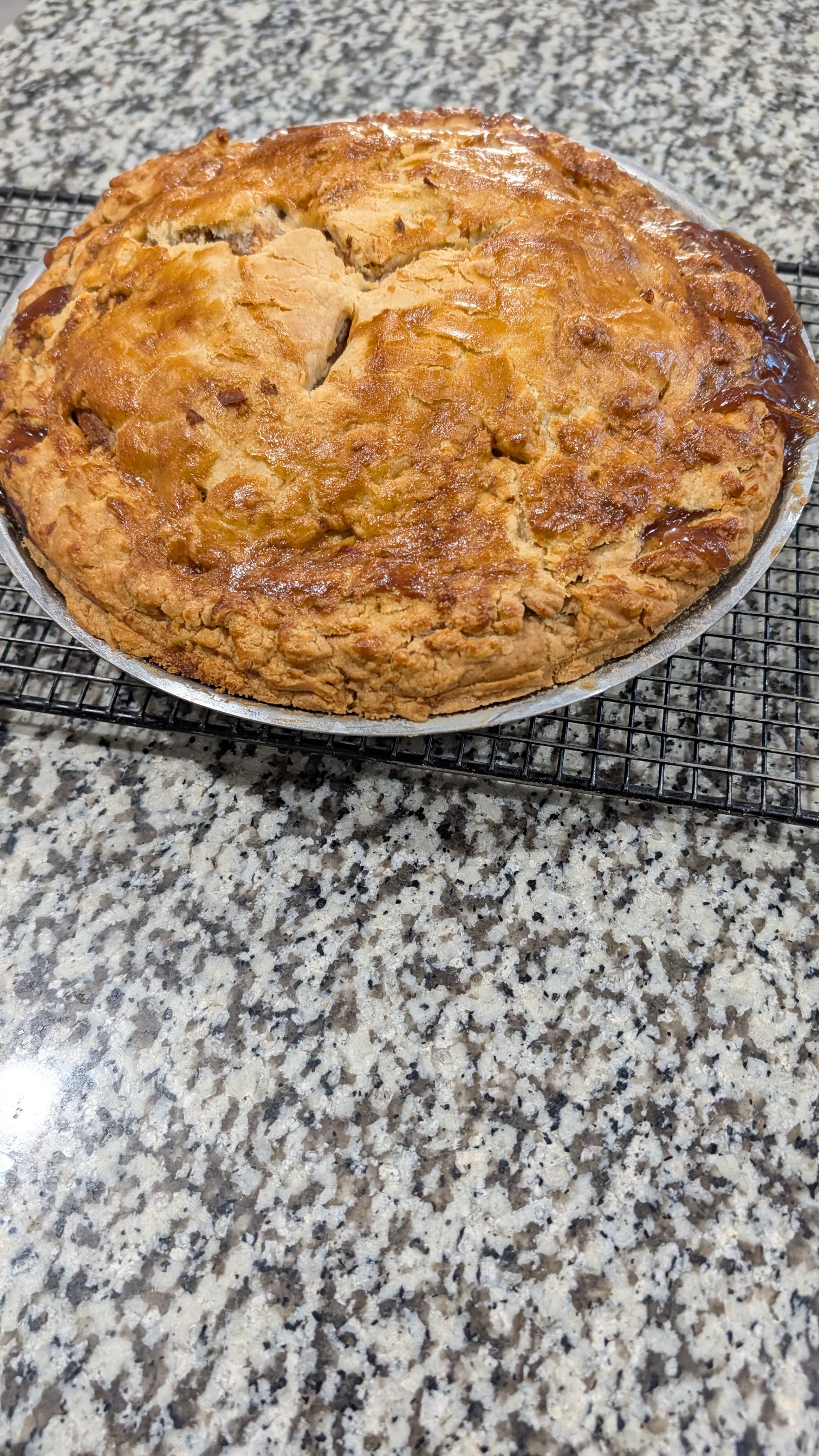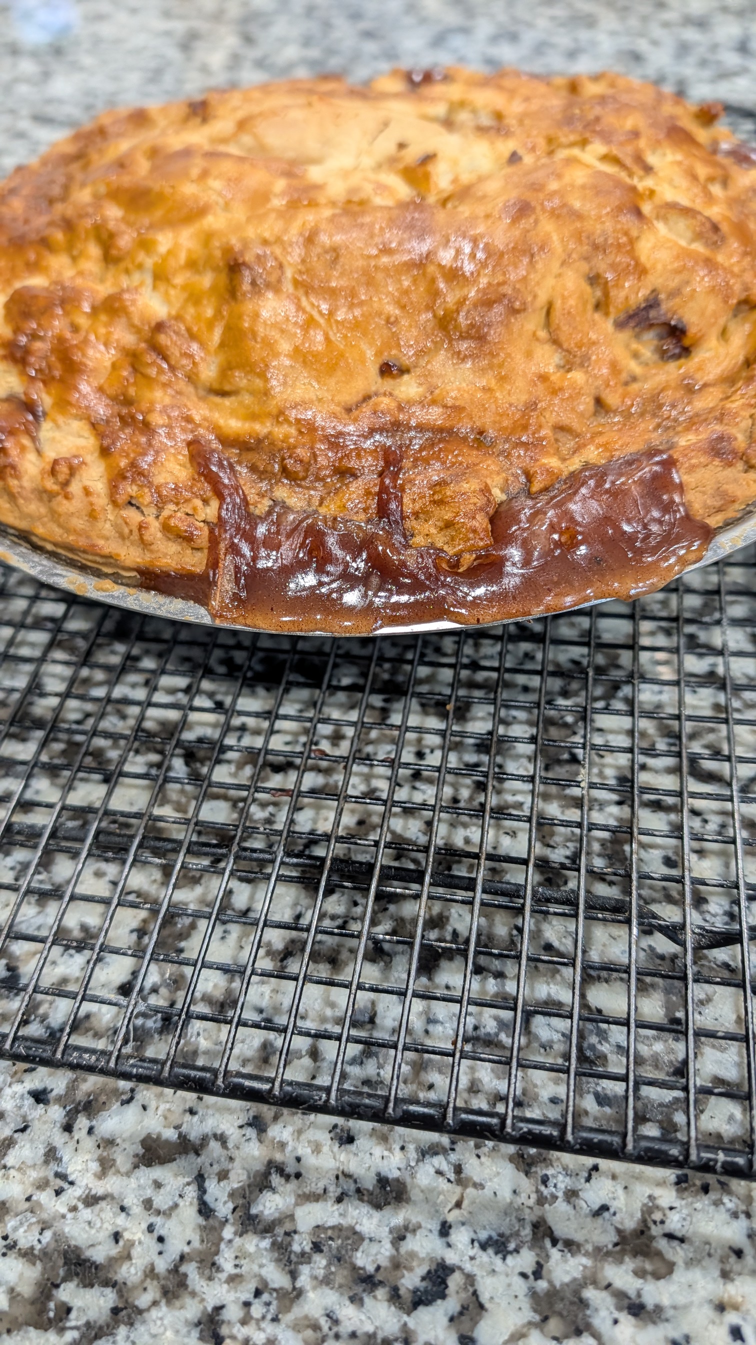 Not the most beautiful pie I ever made. That being said, the oozing goodness is telling me it will up with my most delicious! The pastry was off this time. It was all I could to make it work.