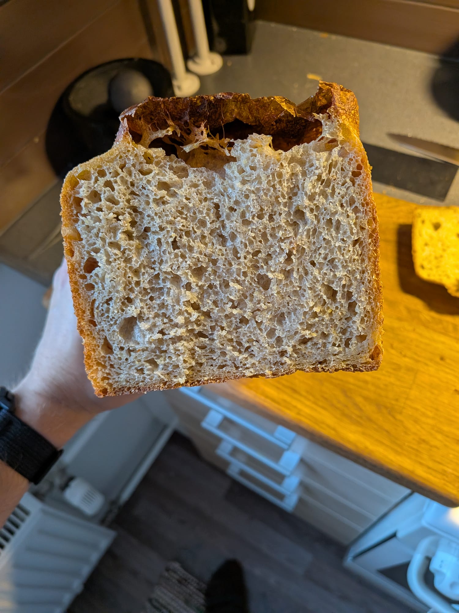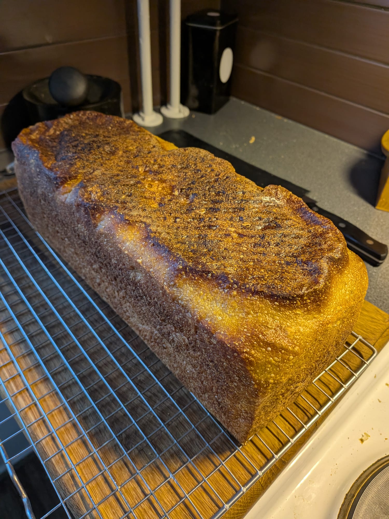 This loaf I bulk fermented for 5 hours (approx 50 - 75 % increase in volume), shaped, proof 1 h on the counter and 20 h in fridge. Baked cold from the fridge in 200 C for 50 min (lid on), cool 10 min in the tin (lid off) and rest of the cooling down on wire rack.